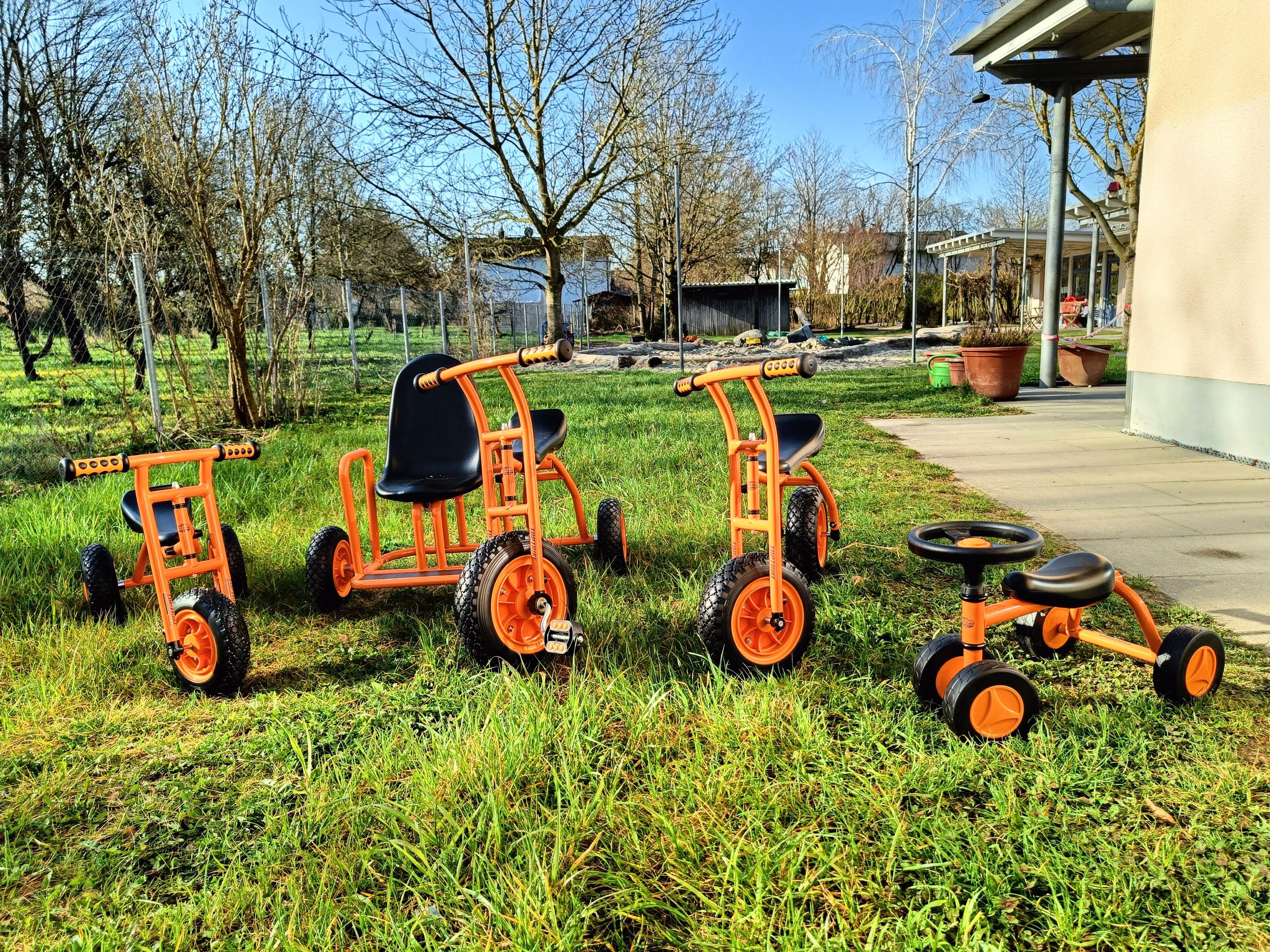 Der Garten rund um unser Kinderhaus ist sehr großzügig und als Natur- und Erlebnisgarten konzipiert. Er bietet den Kindern vielfältige Möglichkeiten, ihren Bewegungsdrang auszuleben. Eine Hangrutsche, eine Kletterspinne, eine Vogelnestschaukel, eine Doppel-Schaukel, eine Tischtennisplatte, ein Trampolin, ein 3-Stufen-Reck, ein Bällebad im Bauwagen und ein großzügiger Sandkasten laden zum Spielen und Entdecken ein.
