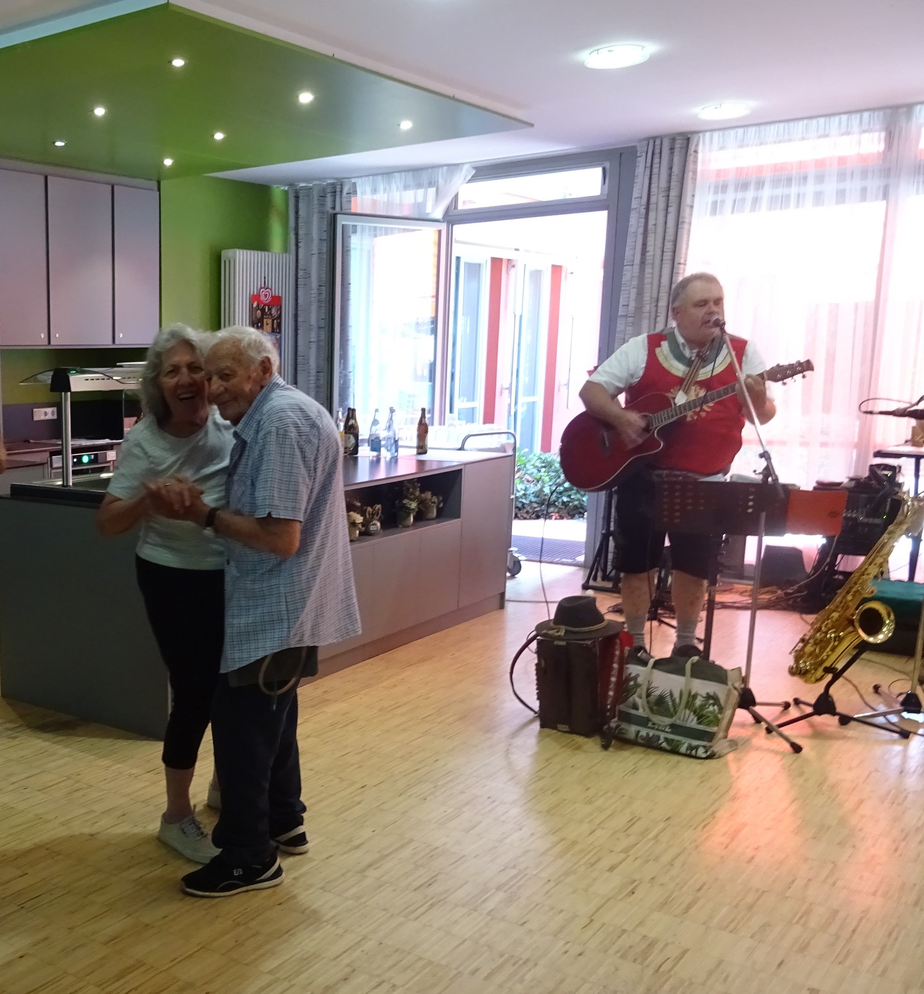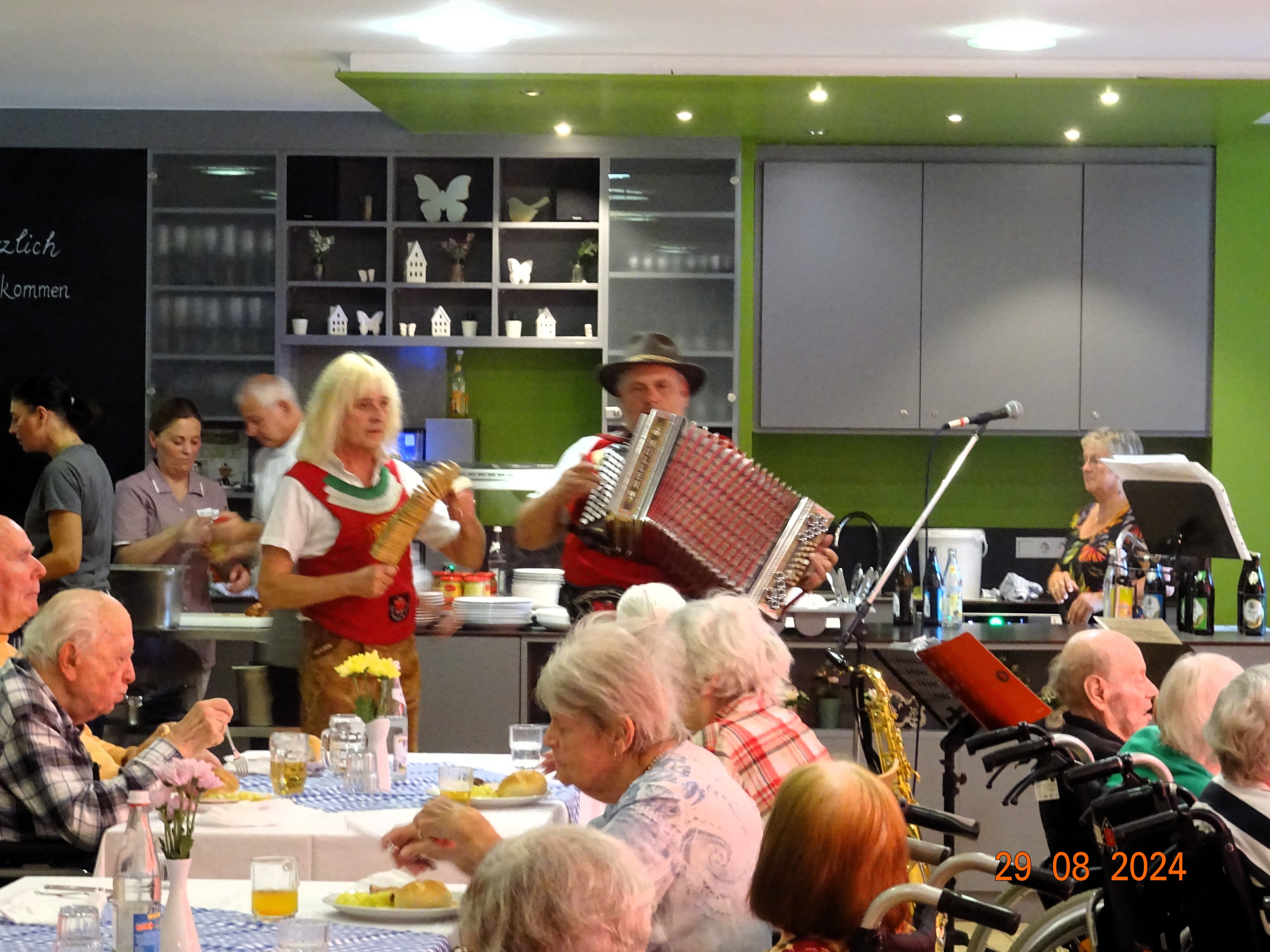 Parallel dazu fand ein weiteres kleines Frühschoppen für die Bewohnerinnen und Bewohner im gerontopsychiatrischen Wohnbereich unter musikalischer Begleitung einer unserer Betreuungsassistentinnen am Akkordeon statt. Auch dort wurde gut gegessen, gesungen und getanzt und die bayerische Lebensfreude gefeiert.