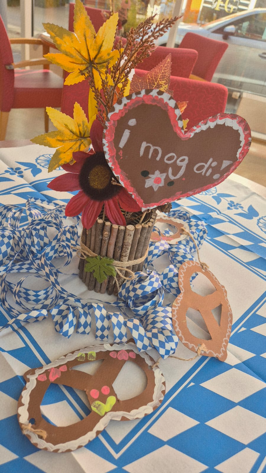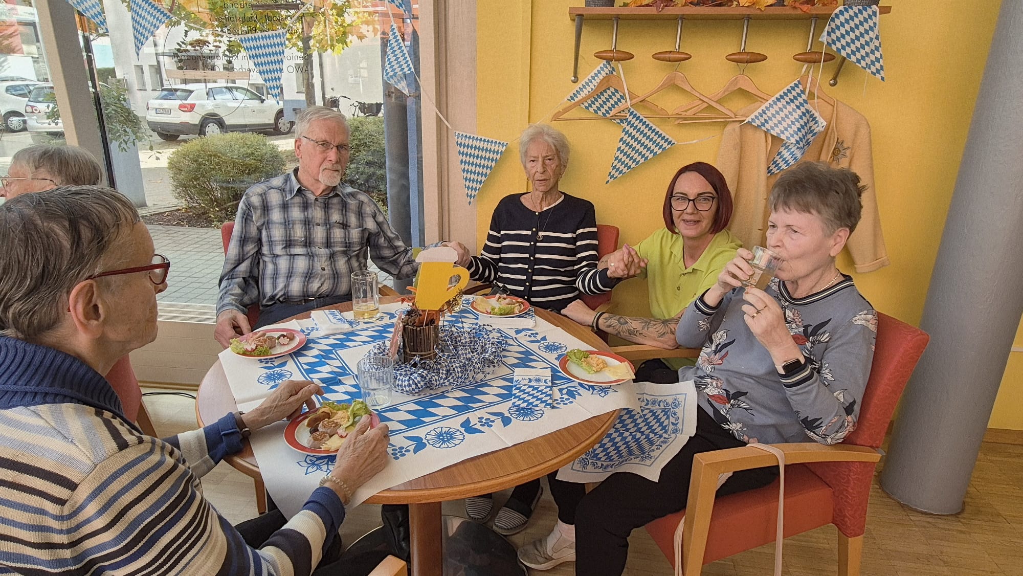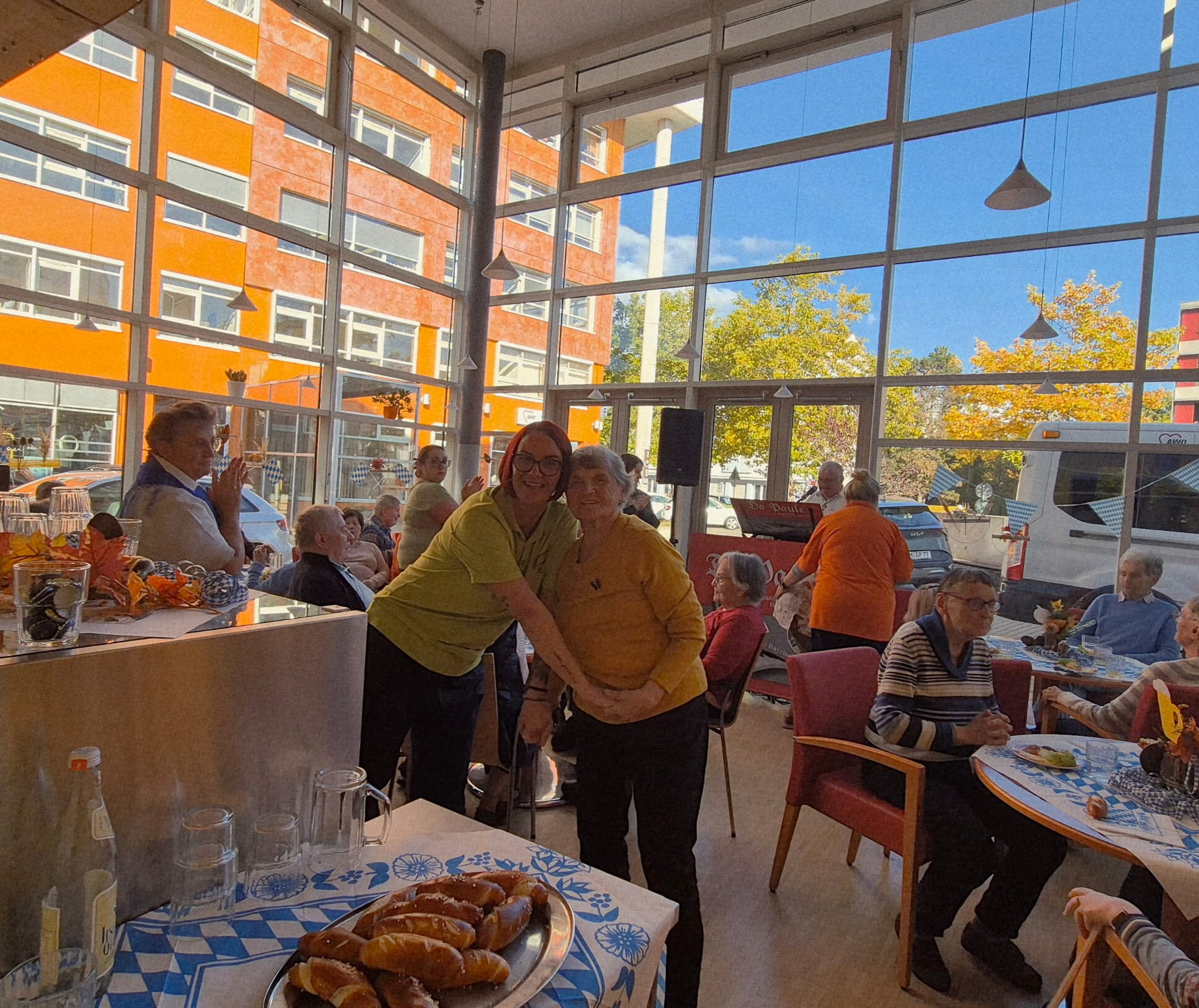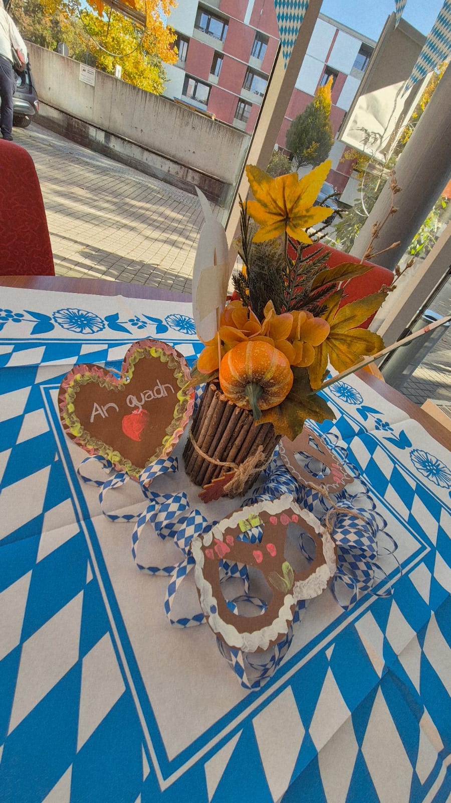 In unserer Cafeteria und der Galerie wurde vor Kurzem zünftig gefeiert - und zwar bei unserem diesjährigen Herbst- bzw. Oktoberfest! Schon beim Betreten der liebevoll geschmückten Räume kam echte Wiesn-Stimmung auf: bunte Herbstdekoration, blau-weiße Akzente und fröhliche Musik sorgten für eine festliche Atmosphäre.