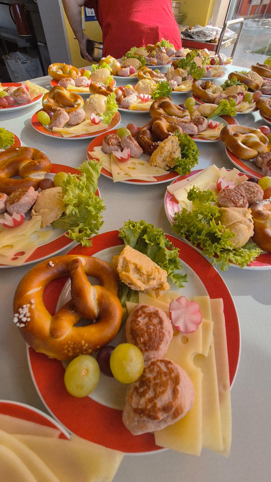 Zu Beginn des Festes gratulierten wir einer Kollegin herzlich zum Geburtstag, bevor die leckere Brotzeit serviert wurde. Auf den schön angerichteten Tellern fanden sich Leberkäse, Käse und frische Brezen - ein Genuss für alle!
