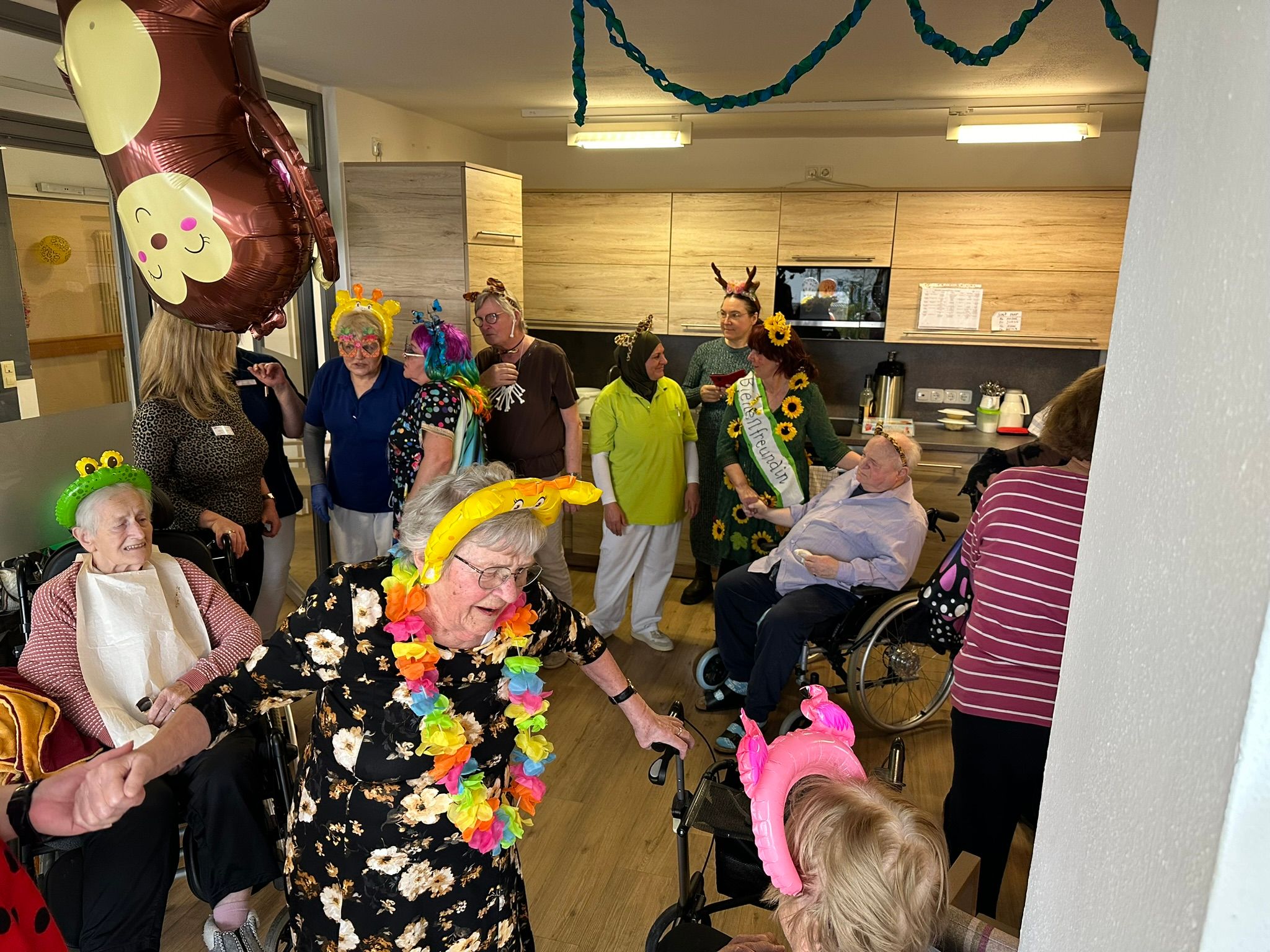 Los ging es am Unsinnigen Donnerstag mit dem Faschingsumzug vom Sozialdienst durch alle Wohnbereiche. Deren Motto war in diesem Jahr „Garten und Gärtner“. Jeder Wohnbereich wählte in diesem Jahr ein eigenes Motto, vom „Dschungel“ über „Aladin“ und „Die sieben Zwerge“. So erschien das Haus sehr bunt und farbenfroh.