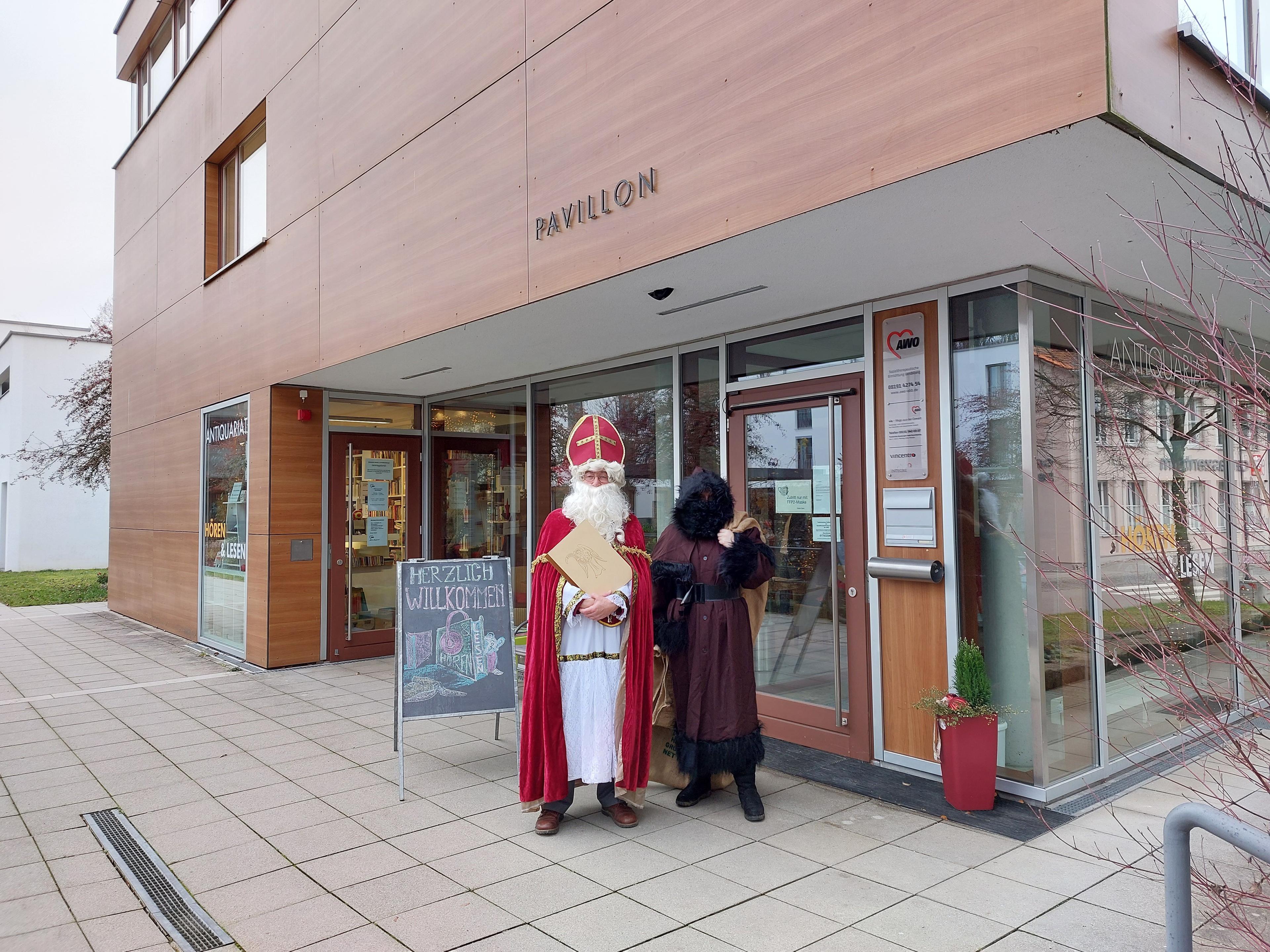 Bei der letzten Teamsitzung im Antiquariat Hören & Lesen im AWO-Zentrum Landsberg am Lech verstärkten am 6. Dezember unverhofft zwei ganz besondere Gäste die Runde. Mit lustigen Reimen und besinnlichen Sprüchen bedankte sich das himmlische Duo bei den Zuverdienstler*innen und Ehrenamtlichen für ein weiteres Jahr voller Engagement und Kreativität. Am Tag zuvor hatten Nikolaus und Krampus schon die Bewohner der Langzeitwohngruppe beschenkt. Und alle im Haus sind sich einig: Es weihnachtet sehr in diesen Tagen.